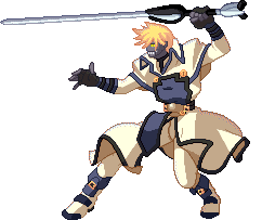 Robo Ky from Guilty Gear, depicted in pixel art, holding a sword and performing a dynamic attack.