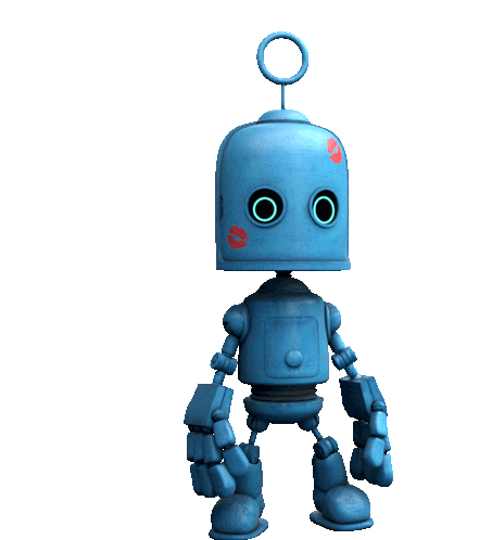 A cute blue robot with red kiss marks waves hello, embodying the playful spirit of Love Island.