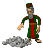 A cartoon man with a beard and robe stands angrily next to a pile of rocks, looking frustrated.