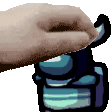 Rolobi's pixelated hand gently holds a wiggling blue Among Us character, a cute pet sticker.