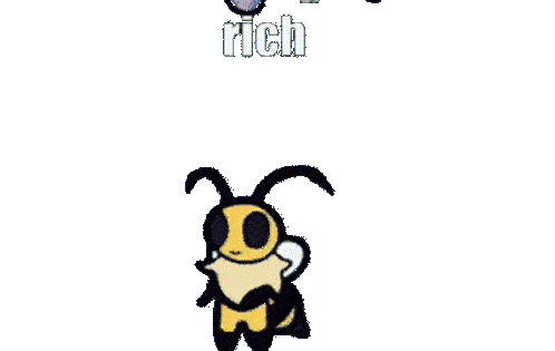 Animated sticker of Roly Vi, a bee character from Bug Fables, being showered with red and blue particles under the word 'rich'.