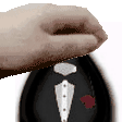 A hand gently pets the adorable Rook Pfp, a black, egg-shaped character wearing a tuxedo and bow tie.