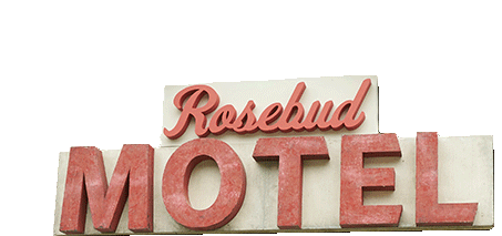 The iconic Rosebud Motel sign, featuring red script and block letters on a light background, from Schitt's Creek.