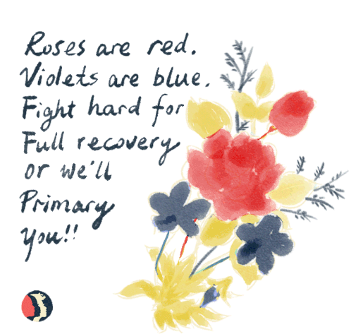 A watercolor bouquet accompanies a modern twist on the 'Roses are Red' poem, urging a 'Fight hard for Full recovery or we'll Primary you!'