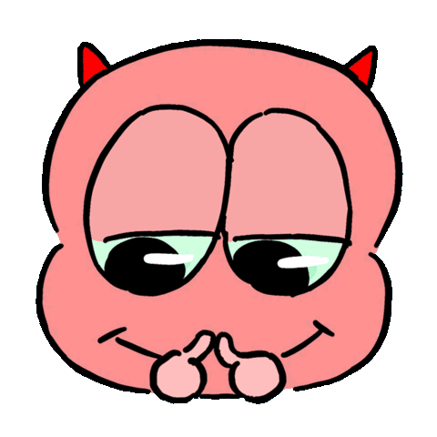 A cute, shy pink blob character with rosy cheeks and small red horns looks down bashfully, touching its fingers together.