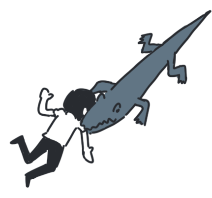 Black and white drawing of a crocodile attacking a person, rotating and swinging dynamically.