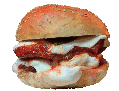 A delicious-looking burger with two patties, melted cheese, and red sauce slowly rotates, showcasing its layers.