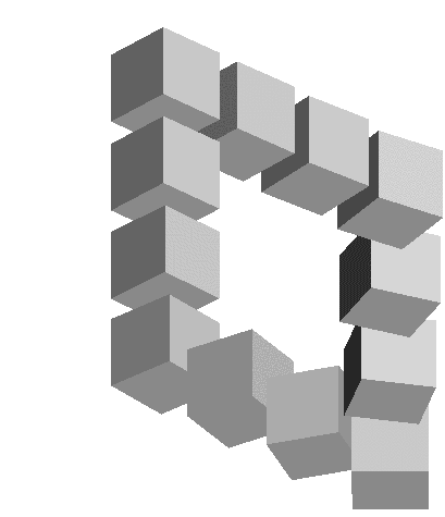 An animated sticker featuring an impossible square illusion, constructed from blocks, continuously rotating and shifting perspective.