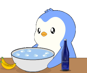 Pudgy Penguin starts the day with an invigorating ice bath, dipping its head into a bowl of icy water next to bananas and a Saratoga water bottle.