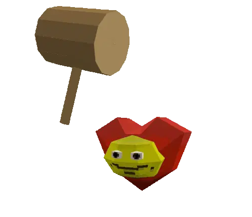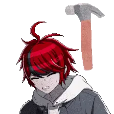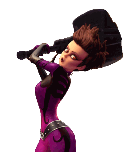 a cartoon character in a purple suit holds a large hammer over her head