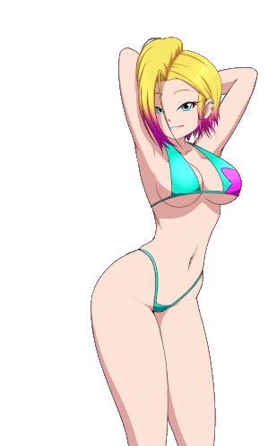 Animated sticker of Roxy Reit, an anime girl in a vibrant bikini, posing with her hands behind her head.
