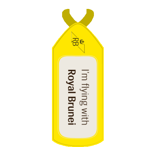 A yellow animated luggage tag for Royal Brunei Airlines, featuring the text 'I'm flying with Royal Brunei' and the RB logo.