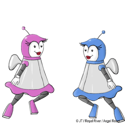 Two Royalriver Angel Robots, one giving a rose to the other, with "LOVE YOU" text and a heart.