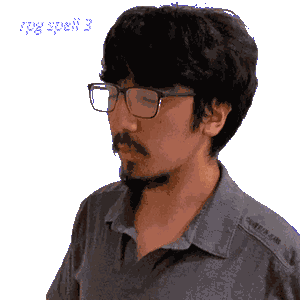 a pixelated image of a man wearing glasses and a grey shirt