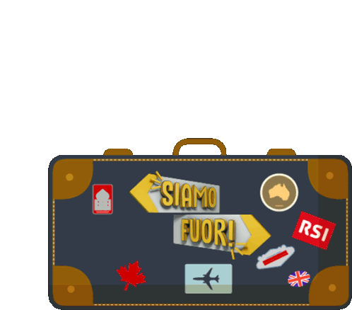 RSI Siamo Fuori! Animated sticker featuring a travel suitcase with Carlotta Gallino, Christian Frapolli, Davide Riva.