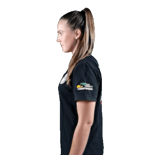 Rene, a basketball player, stands confidently in her team polo shirt, turning to face the camera with arms crossed.