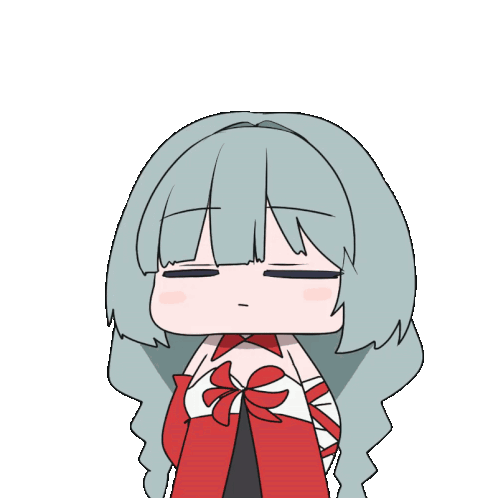 A chibi anime girl with light blue hair and a red dress, looking unbothered and slightly melancholic.