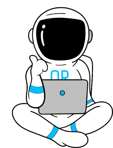 Ruanzikaad, a cartoon character in a space suit, sits cross-legged, holding a laptop, smiling and giving a thumbs up.