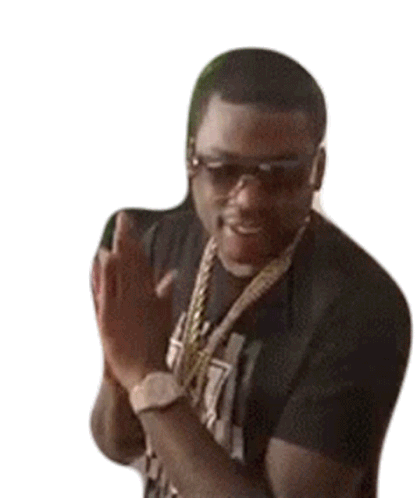 Meek Mill rubbing his hands together with a sly, scheming smile, looking ready for action.