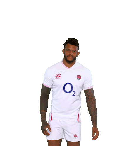 An England rugby player with tattoos places his hand on his heart, then pumps his fist as 'LET'S GO' appears, showing determination.