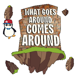 A cute Pudgy Penguin wearing a red cap and bow tie sits on a floating island with the text 'What Goes Around Comes Around'.