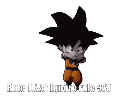 Chibi Goku performs a dance while displaying the meme caption "Rule 1029: Ignore rule 379" in a pixel art style.