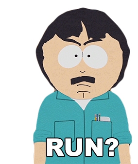 Randy Marsh from South Park looking surprised and asking 'RUN?', perfect for moments of doubt or needing to escape.