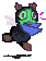 A pixel art monster with a green face and purple eyes is running away in a panic, conveying urgency and fear.