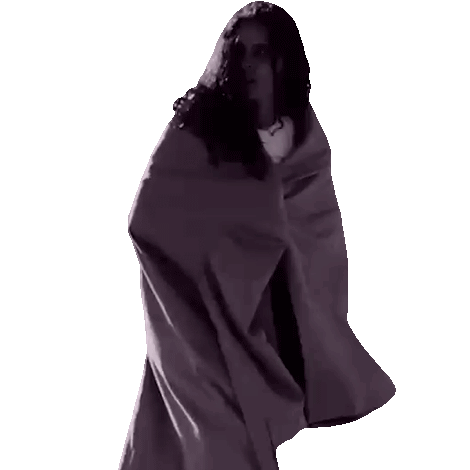 a woman in a long purple cape is standing in front of a white background