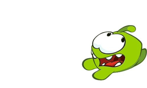 Om Nom, the beloved green character from Cut the Rope, scurries away with a surprised expression, looking like he's fleeing.