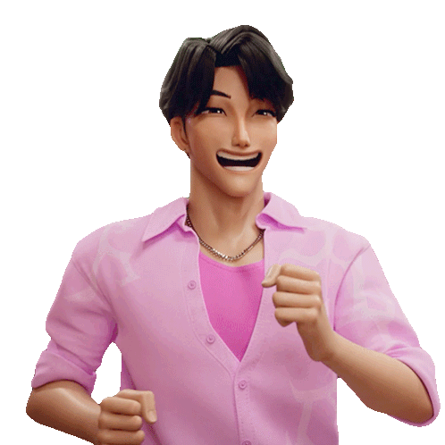 Ginu, a 3D animated character, runs with a wide, joyful smile, wearing a pink shirt and silver chain.