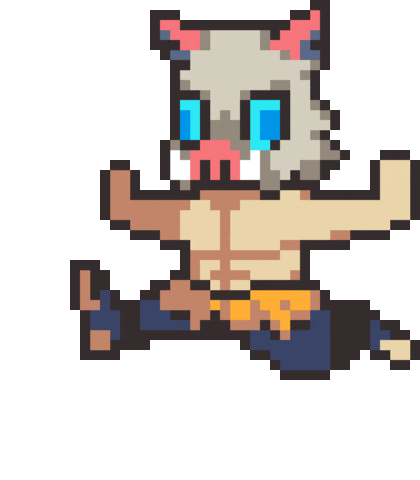 Inosuke Hashibara from Demon Slayer, depicted in pixel art, energetically running with his iconic pig head mask.