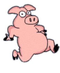 A cartoon pink pig with big eyes and a snout is animatedly running or dancing with its limbs in motion.