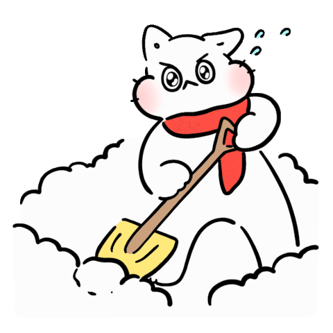 An animated white cat in a red scarf looks stressed while diligently shoveling a large pile of snow, conveying a 'much work' or 'busy' feeling.