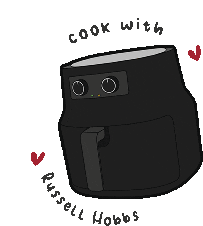 An animated sticker featuring a black air fryer with the text "cook with Russell Hobbs," promoting the brand.