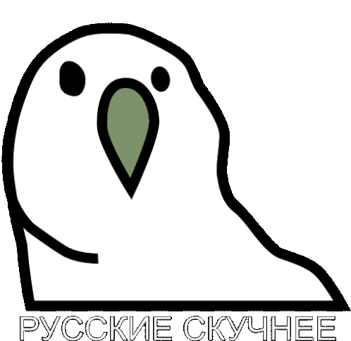 Animated cartoon bird with a green beak and black eyes, blinking and moving its beak, with Russian text 'РУССКИЕ СКУЧНЕЕ' below.