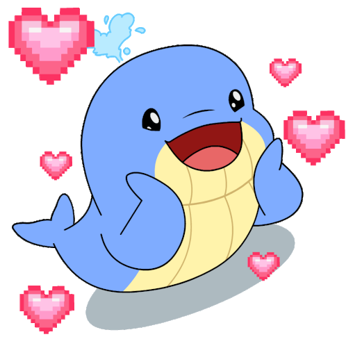 Rwa Wally, an adorable blue and yellow whale, happily smiles surrounded by pink pixelated hearts.