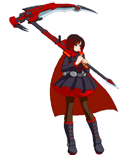 Ruby Rose from RWBY, a girl with a red cape, stands ready with her iconic Crescent Rose scythe.