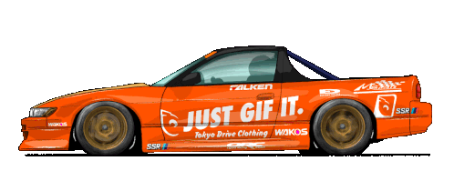 An orange JDM drift car featuring 'JUST GIF IT.' branding, with sponsor logos like Falken and WAKOS.