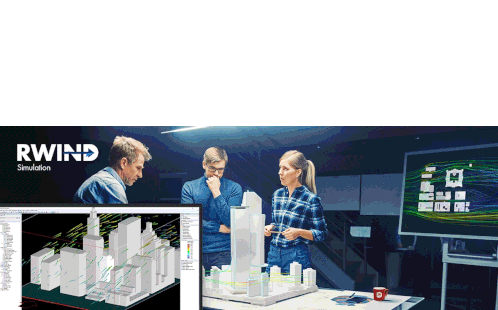 Engineers collaborate, analyzing a detailed city model with Rwind simulation software for wind analysis and structural design.