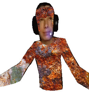 a 3d model of a man wearing headphones and a rusty jacket