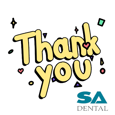 An animated sticker featuring the SA Dental logo and the phrase 'Thank you' with floating hearts and confetti.