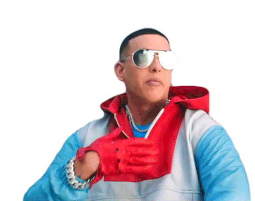 Daddy Yankee, in a stylish jacket and sunglasses, confidently brushes off his shoulder with a cool, suave gesture.