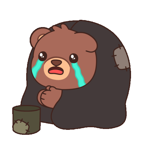 A sad, lonely teddy bear cartoon crying with tears, holding a cup and begging for spare change.