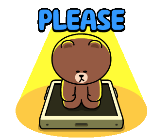 Brown bear character from Line Friends sitting on a phone, looking sad and asking "Please" under a spotlight.