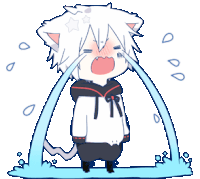 An anime-style cat boy with white hair and cat ears cries profusely, with large tears streaming down his face and splashing.