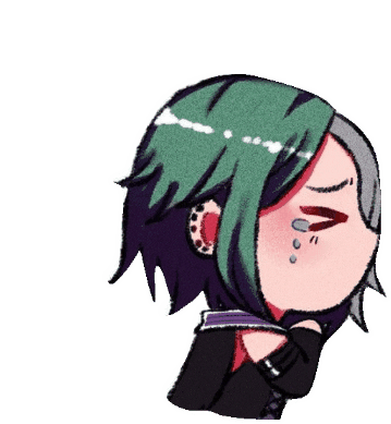 A cute chibi anime character, Loki, with green and grey hair, is shown crying sadly.