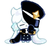 Milky Way Cookie from Cookie Run Kingdom appears sad and dejected, wearing a distinctive uniform and hat.