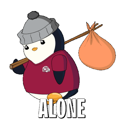 A pudgy penguin wearing a beanie and shirt, carrying a hobo stick with a bindle, looking sad and alone.