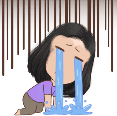 A cartoon character kneels, looking down with a sad expression, then bursts into intense tears, symbolizing deep sorrow.